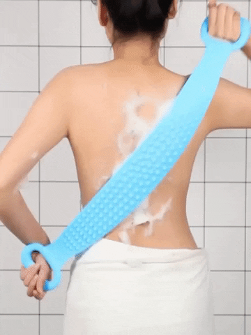- GENTLE EXFOLIATION: The silicone shower body scrubber extends 1cm dense brush head, penetrates into pores to clean dirt, and freshens. The silicone back scrub is not too coarse to irritate sensitive skin and it ensures anti-slip and comfortable grip allowing you to massage and clean your back and other hard-to-reach body areas with ease.